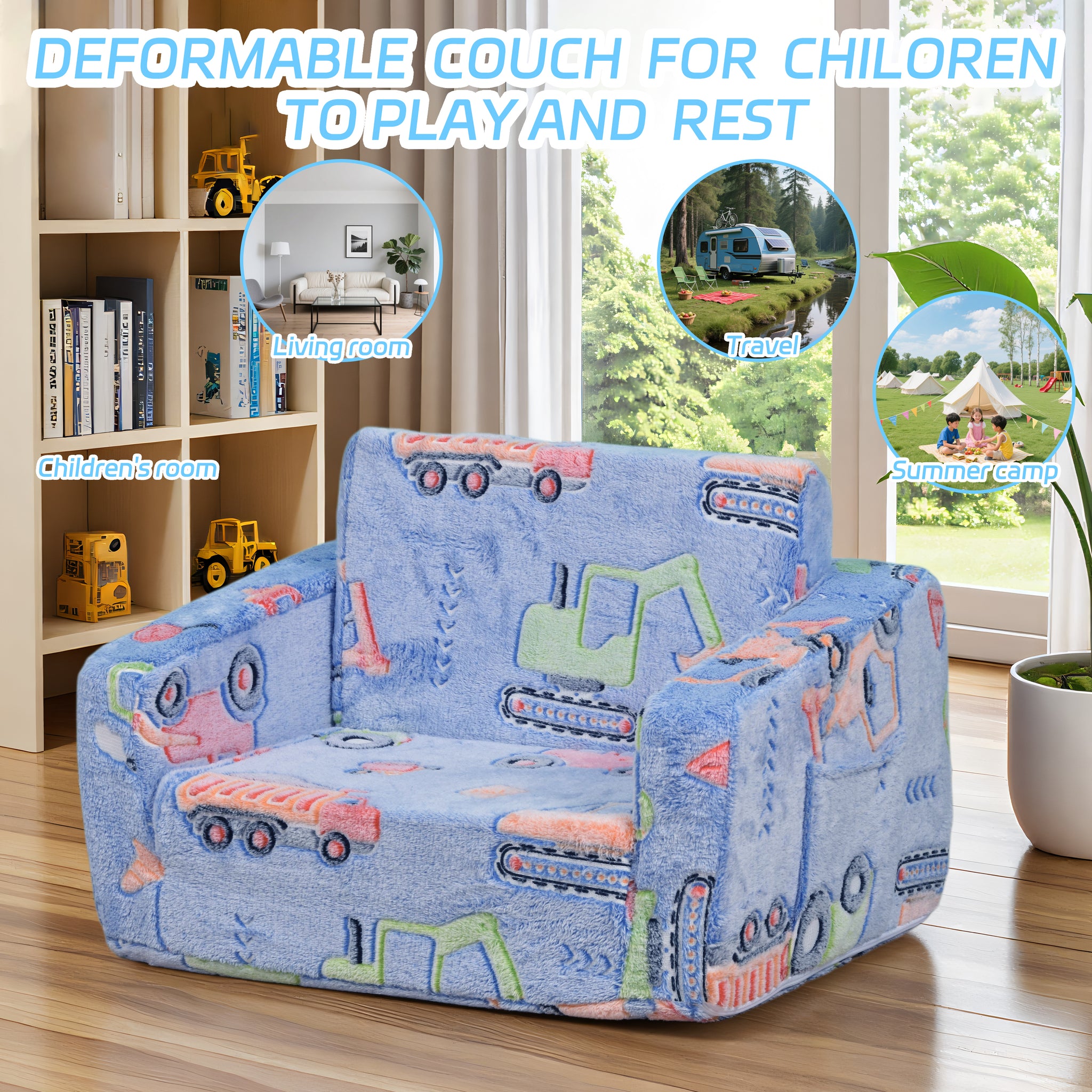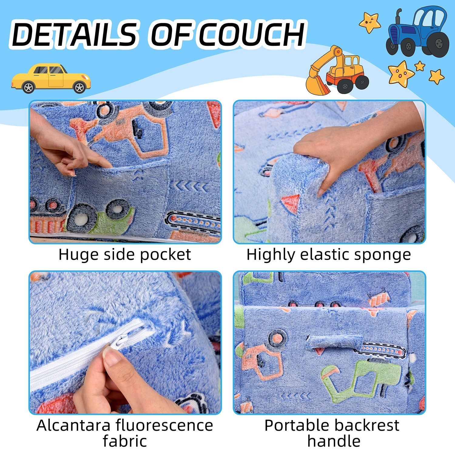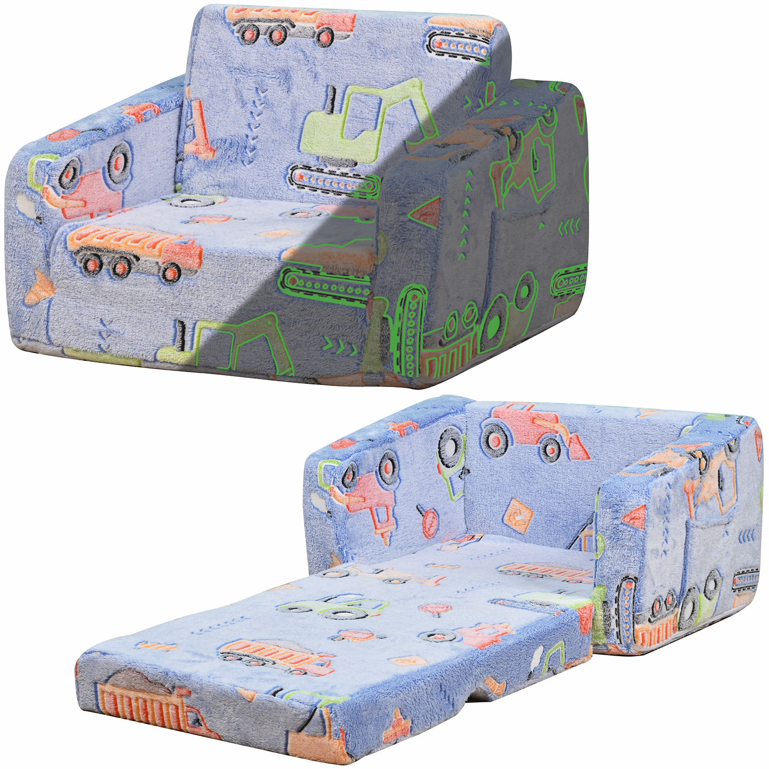 - Magical Glow-in-The-Dark & Kid-Loved Patterns: Expose the sofa to bright light or sunlight for 15+ minutes, and it glows brightly in dark environments—adding a magical touch to bedtime and stimulating kids’ imagination. Blue Car (classic cartoon style). The vivid luminous pattern not only decorates kids’ spaces but also helps them find their sofa easily at night.